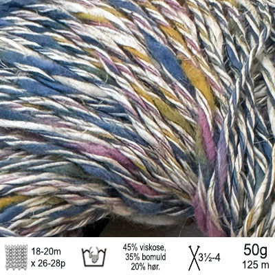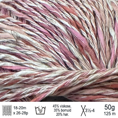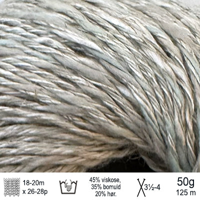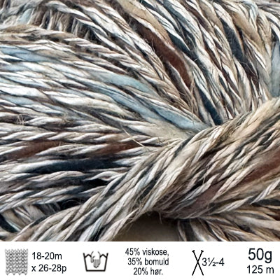 Iris garn fra Permin består af 45% viskose, 35% bomuld, og 20% hør. Iris garn er et lækkert og køligt flamé garn og et oplagt garn til sommerstrik, da det er dejligt kølende på en varm sommerdag og et garn der falder flot. Den lidt skinnende viskose opvejes af den matte bomuld, og det ufarvede hør tilføjer garnet en rustik fornemmelse uden at gøre det stift og kradsende. Desuden giver garnets forskellige farvevarianter og den lette flamé effekt et flot "retro" look. Iris garnet har strikkefasthed på 18-20m X 26-28p og en løbelængde på 125 meter pr. 50 gram.