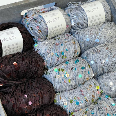 Ja, “glitter”/metalliseret tråd og palietter giver et diskret skær. Bruges alene eller som følgetråd for et glamurøst eller festligt udtryk.