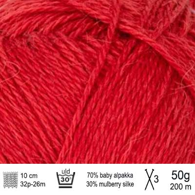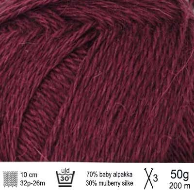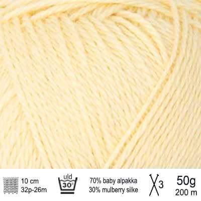 Denne fine uld blandes med silke, hvilket giver garnet en glat overflade, der føles ekstra blid og kølig mod huden. Da alpakka ikke indeholder lanolin, er garnet ofte et godt alternativ til personer med følsom hud eller uldallergi.