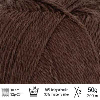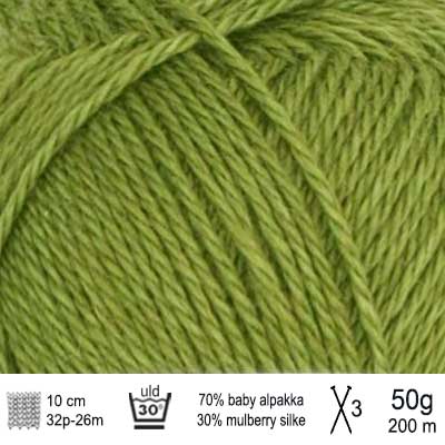 Alpakka Silke garn fra Sandnes Garn indeholder 70% baby alpakka og 30% mulberry silke, som giver varme, blødhed, glans og lidt tyngde. Alpakka Silke er et luksus garn. Det er ekstremt blødt og egner sig især til bluser, cardigans, tørklæder og sjaler. Alpakka Silk fra Sandnes Garn strikkes på pind 3 og løbelængden er ca. 200 meter pr. 50 g.