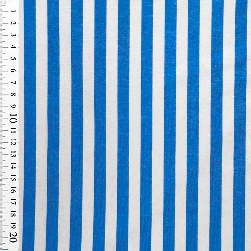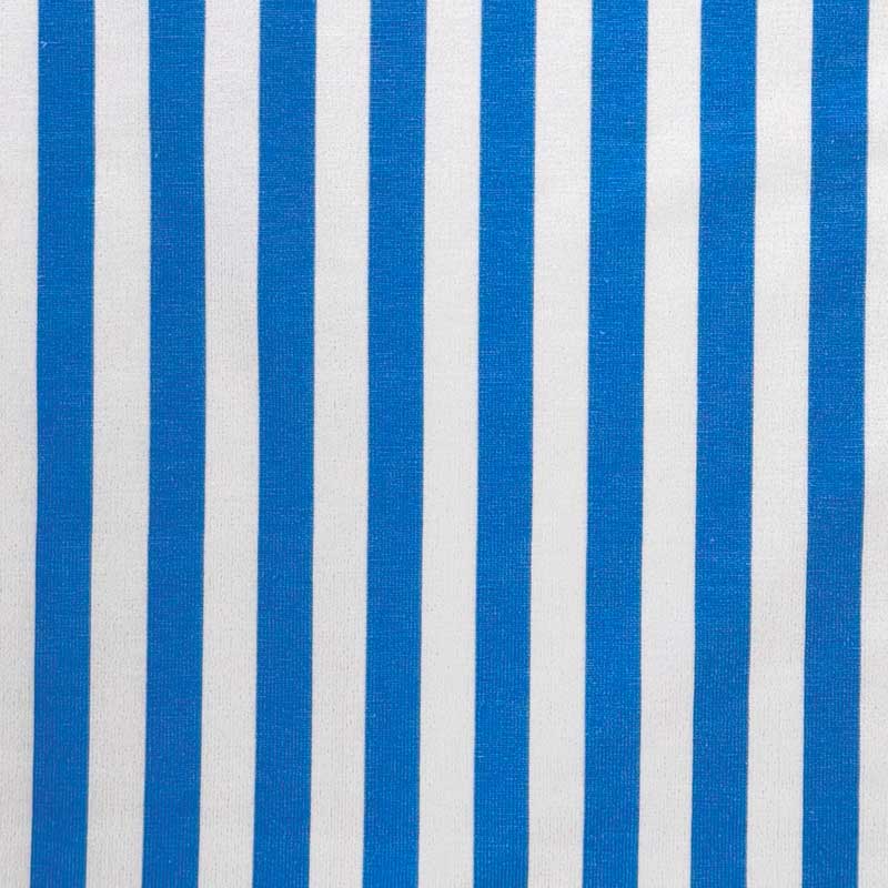Bomuldsjersey i blå med hvide striber Bredde på striberne er 10 mm. En dejlig blød OEKO-TEX kvalitet (205 g/m2). God til kjoler, tunika, bluser, nederdele, overdele.