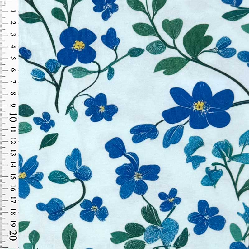 Bomuldsjersey med blå blomster og blade på lys blålig bund. En dejlig (200 g/m2) i OEKO-TEX kvalitet.