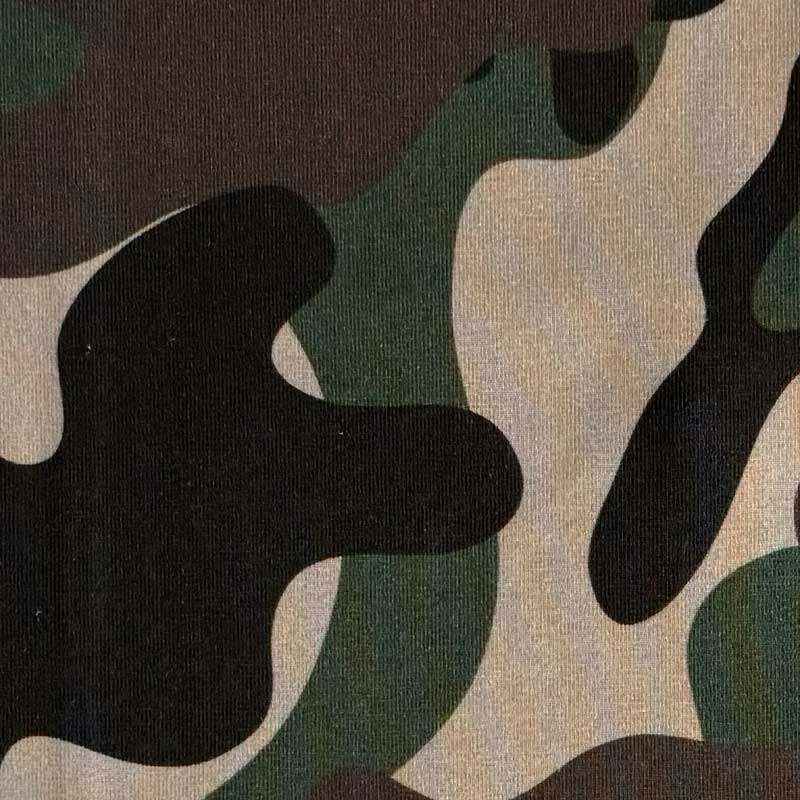Bomuldsjersey med camouflage, tema jungle. En dejlig blød OEKO-TEX kvalitet 220 g/m2. God til kjoler, tunika, bluser, nederdele, overdele.