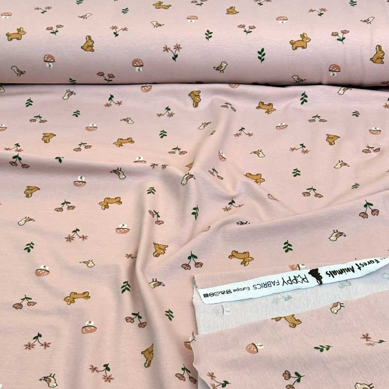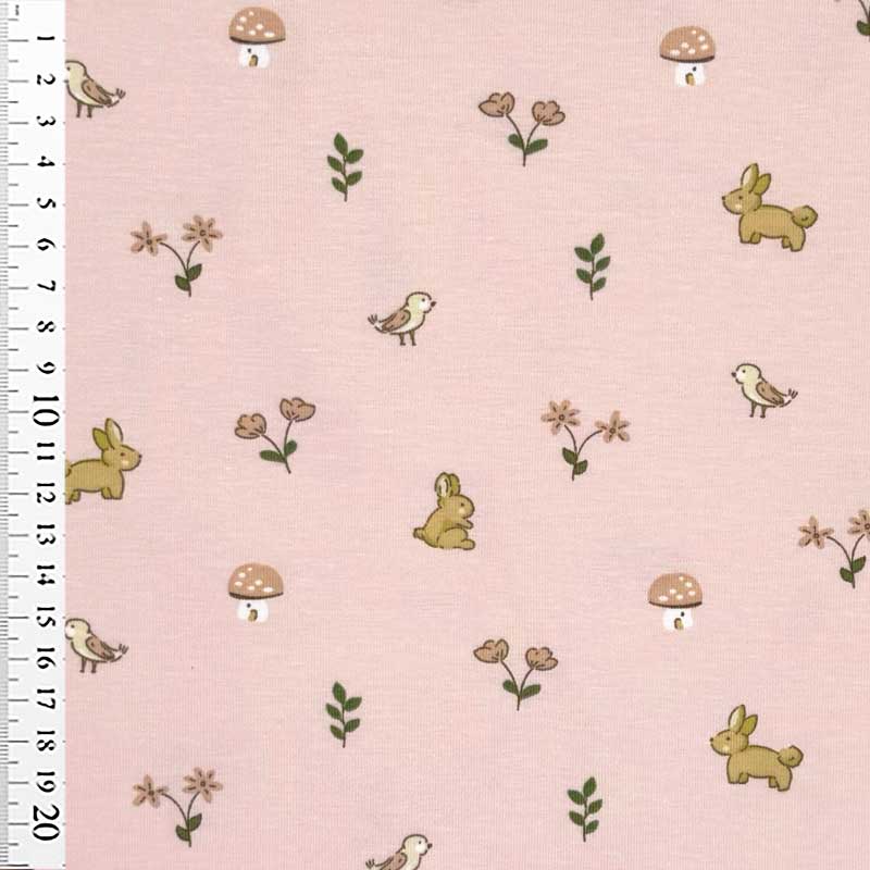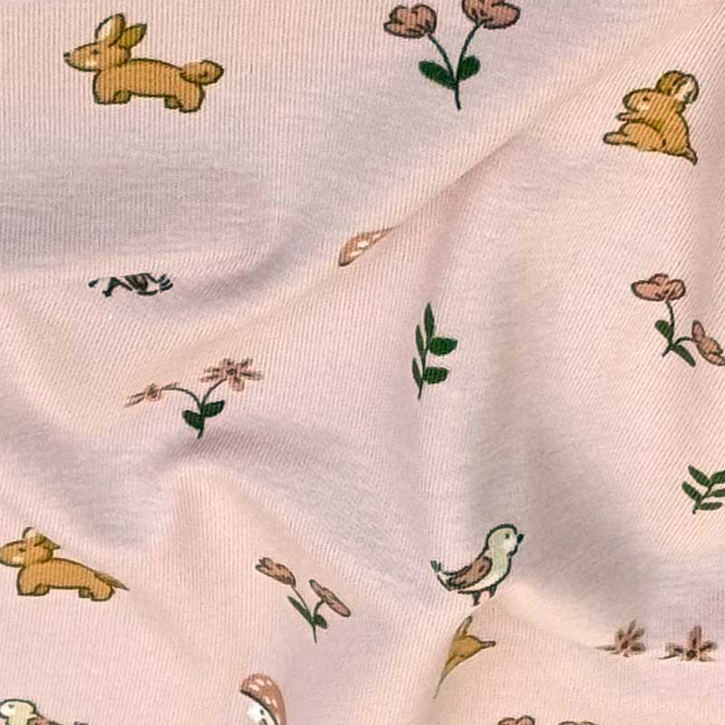 Bomuldsjersey med flora og fauna udvalg på lys rosenrød bund. En dejlig (200 g/m2) i OEKO-TEX og GOTS kvalitet.