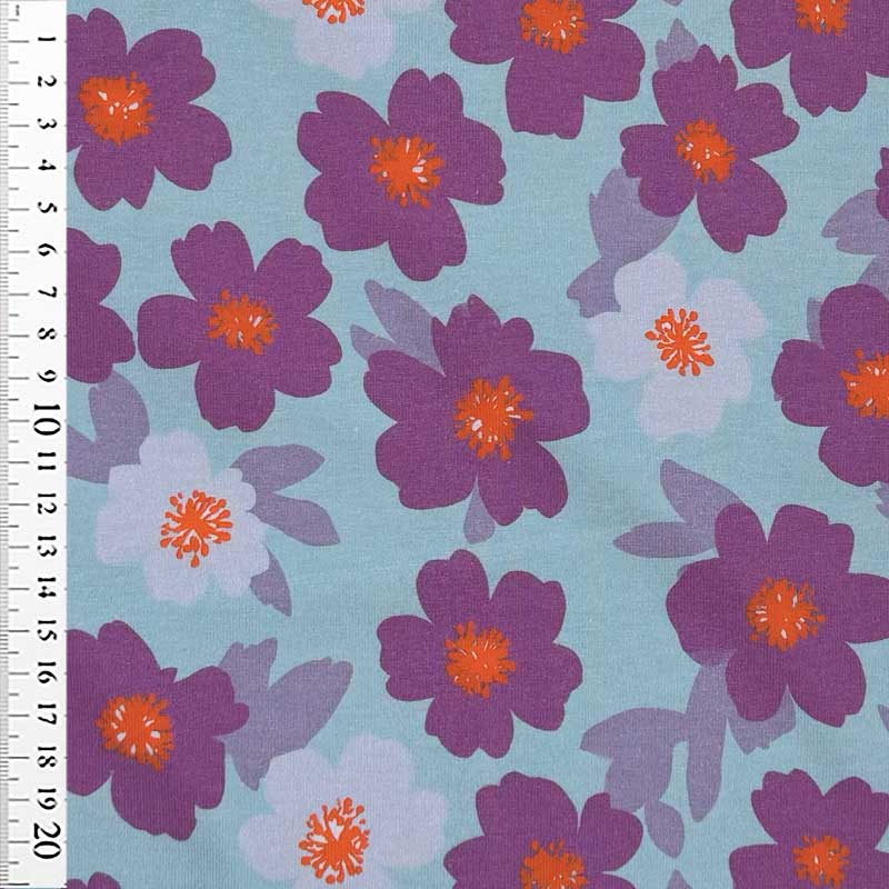 Bomuldsjersey med lilla smørblomster på isblå bund. En dejlig (200 g/m2) i OEKO-TEX kvalitet.