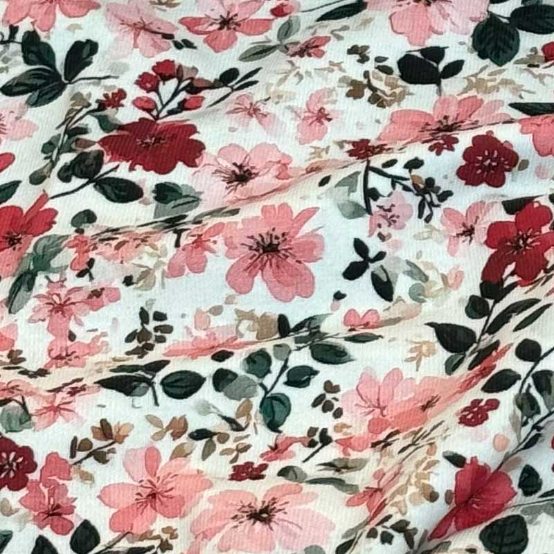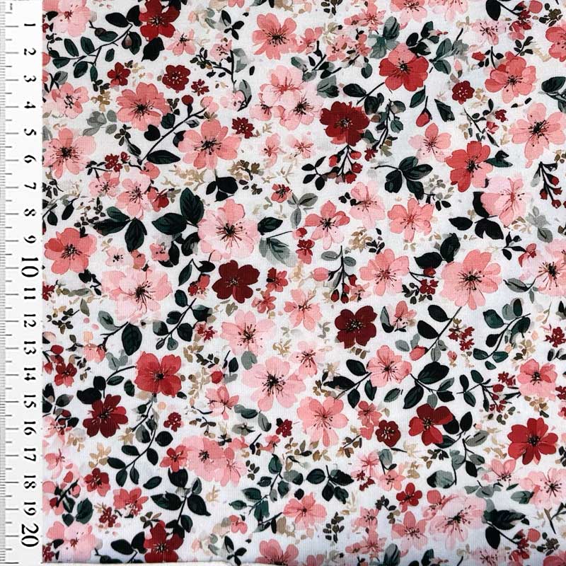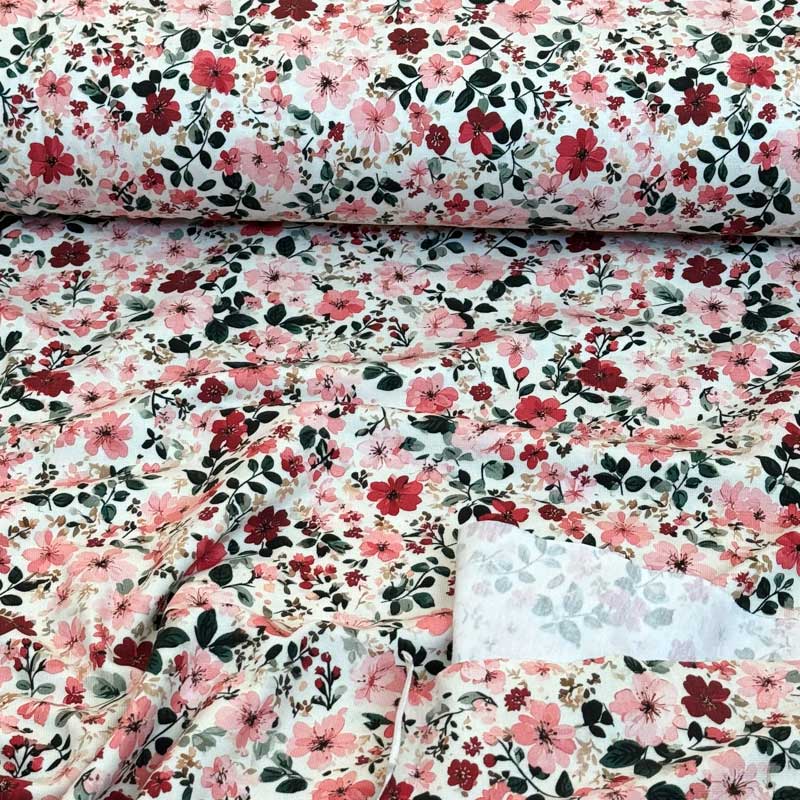Bomuldsjersey med romantiske blomster på hvid bund. En dejlig (200 g/m2) i OEKO-TEX kvalitet.