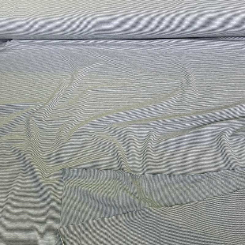 Bomuldsjersey med smalle striber i smaragdgrøn og naturhvid. En dejlig blød OEKO-TEX kvalitet 220 g/m2. God til kjoler, tunika, bluser, nederdele, overdele.