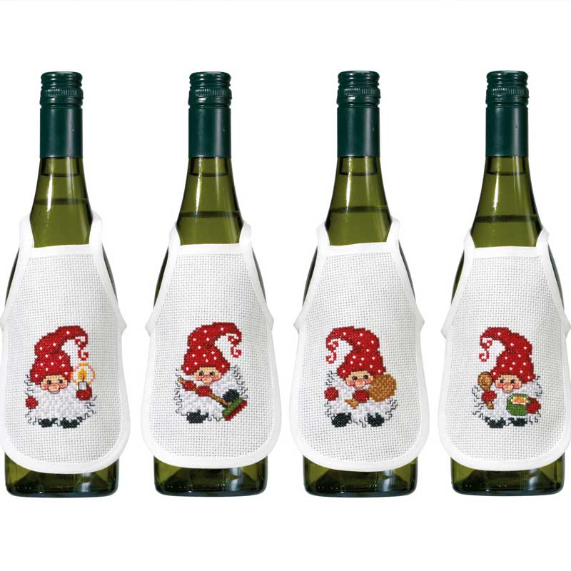 Broderi 4 flaskeforklæder til jul 78-7219 med små søde nissemænd. Syet på Aida 0330B 5,4 tråde/cm i hvid 10 farver DMC Mouliné. Permins broderiprodukter leveres alle med broderistof, garn, nål og mønster.