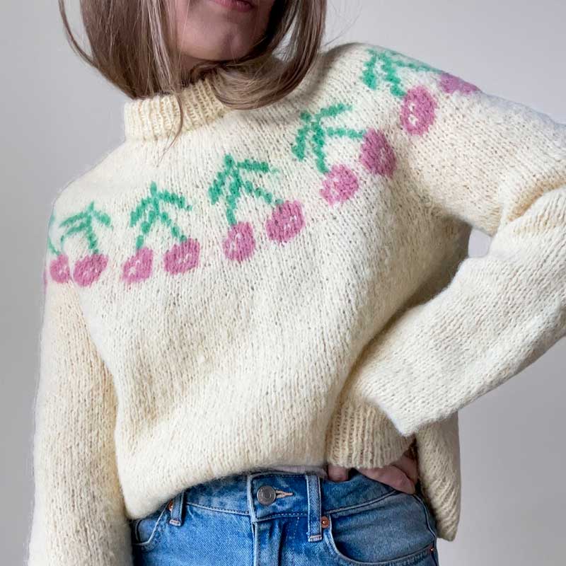 Cherry sweater kan sætte kulør på garderoben, og jeg kan forestille mig nærmest uendelig mange farvekombinationer, der ville være skønne til denne sweater med kirsebær på det runde bærestykke. Den kan gøres sød, morsom, fantasifuld og alt muligt andet, afhængig af farvevalget.
