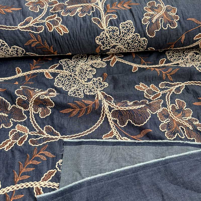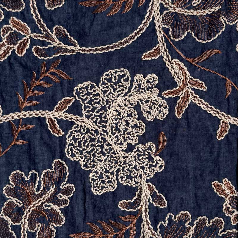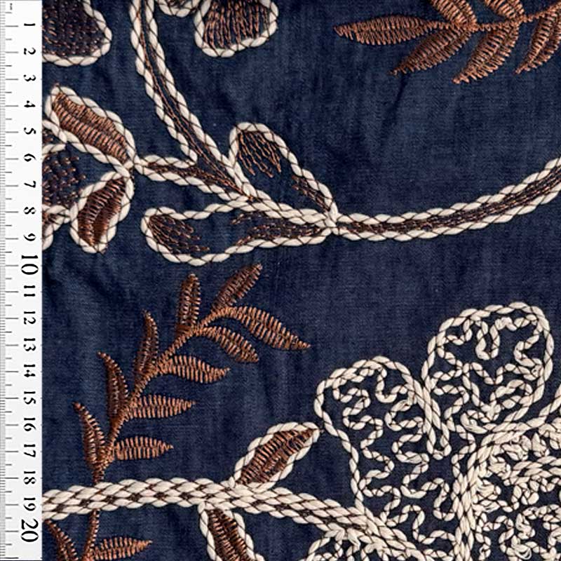 Denim med stor broderi på mellem blå bund. En fin, let metervare med flere muligheder. God til kjoler, skjorter, overdele, m.m.