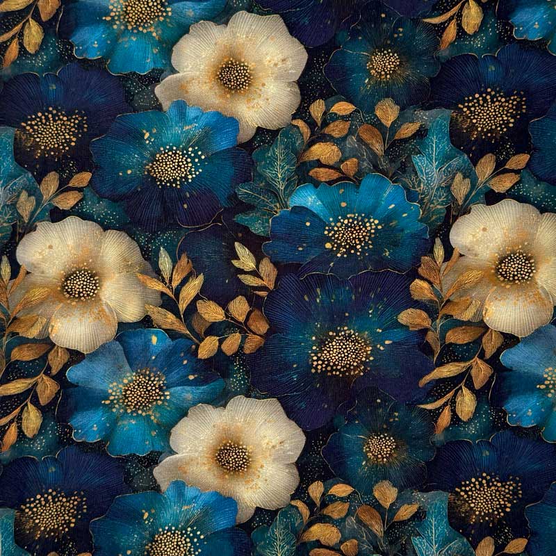 Digital bomuldsjersey med blå guld blomster på mørk bund. God til kjoler, bluser, t-shirts, tunika og overdele.