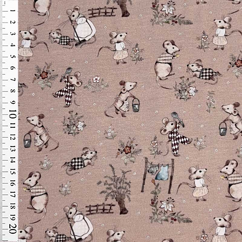 Digital bomuldsjersey med den lille mus II. En dejlig blød kvalitet (220 g/m2) God til kjoler, bluser, nederdele, overdele og børneuniverset.