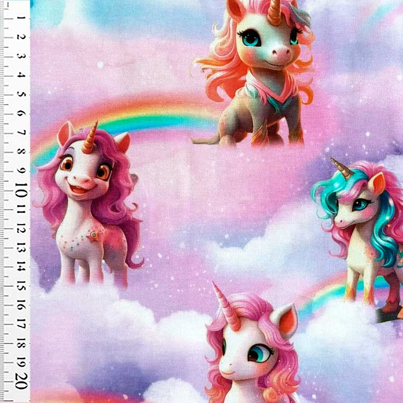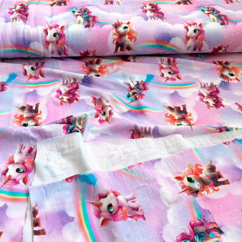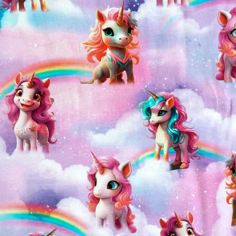 Digital bomuldsjersey med Enhjørning og regnbuer. En dejlig blød kvalitet 220 gr/m2. God til kjoler, tunika, bluser, nederdele, overdele og børneuniverset.