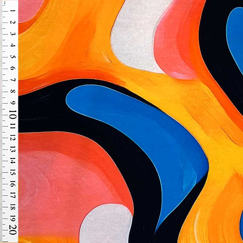 Digital bomuldsjersey med farvespil der svinger. En dejlig blød kvalitet (220 g/m2) God til kjoler, bluser, nederdele, overdele.