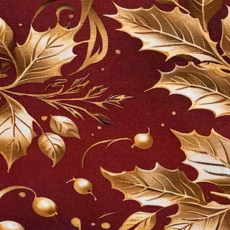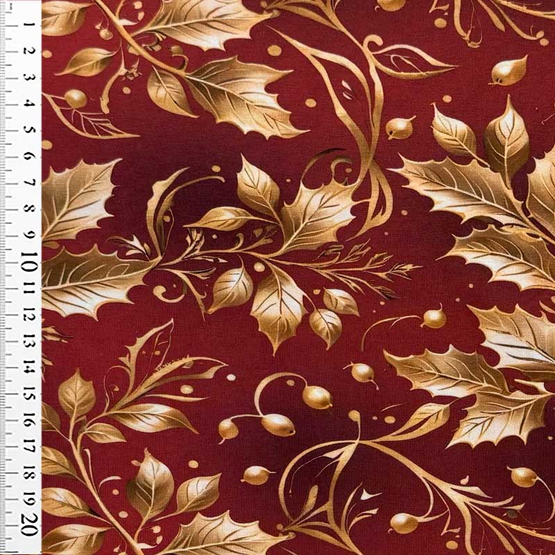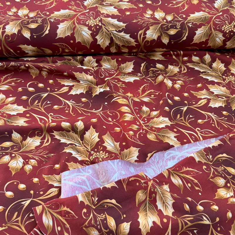Digital bomuldsjersey med guld blade til jul på jule rød bund. God til kjoler, bluser, t-shirts, tunika og overdele.