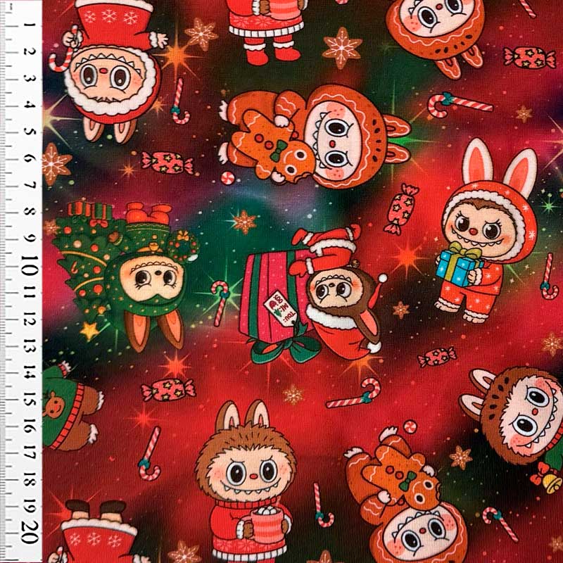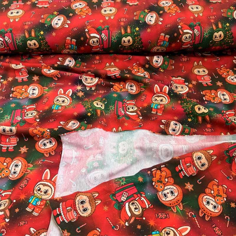 Digital bomuldsjersey med julefigurer og slik på rød bund En dejlig blød OEKO-TEX kvalitet (220 gr/m2). God til kjoler, tunika, bluser, nederdele, overdele og børneuniverset.