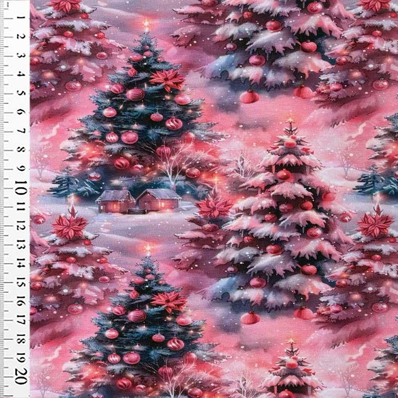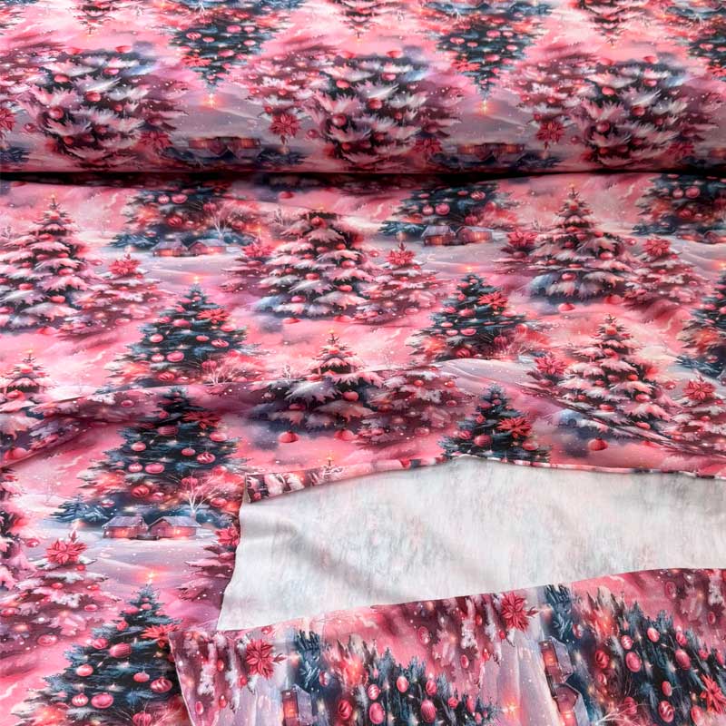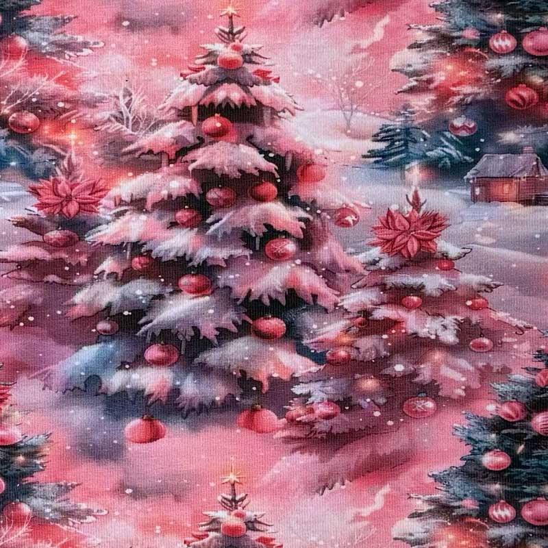 Digital bomuldsjersey med juletræer, sne og kugler på lyserød bund En dejlig blød OEKO-TEX kvalitet (220 gr/m2). God til kjoler, tunika, bluser, nederdele, overdele og børneuniverset.
