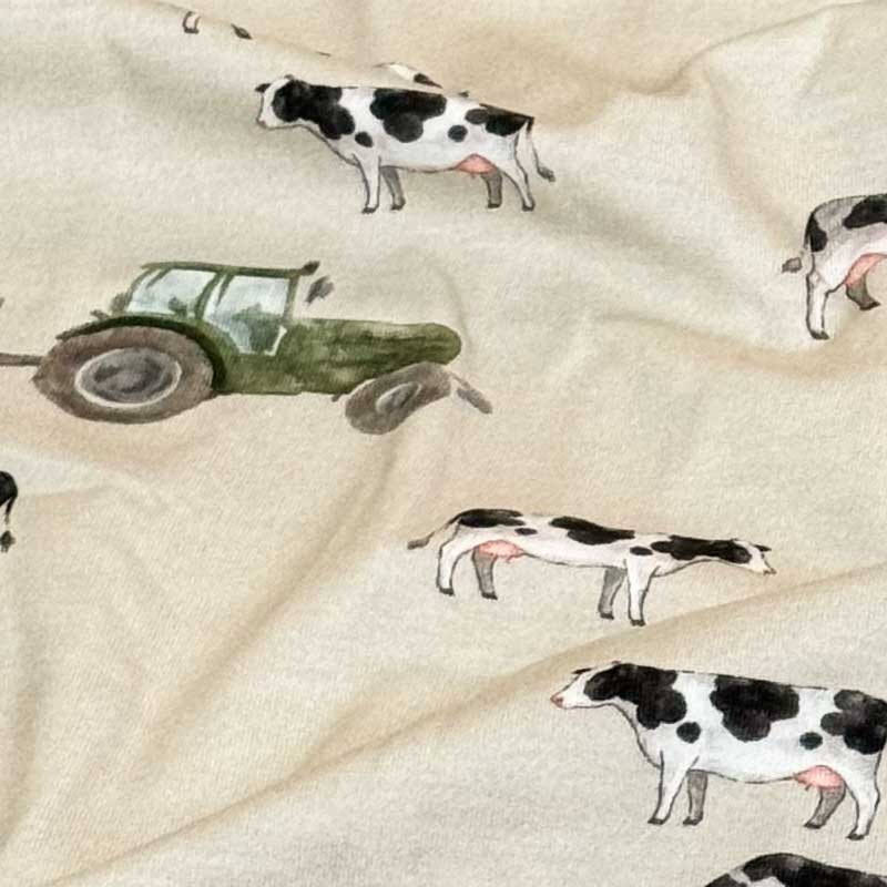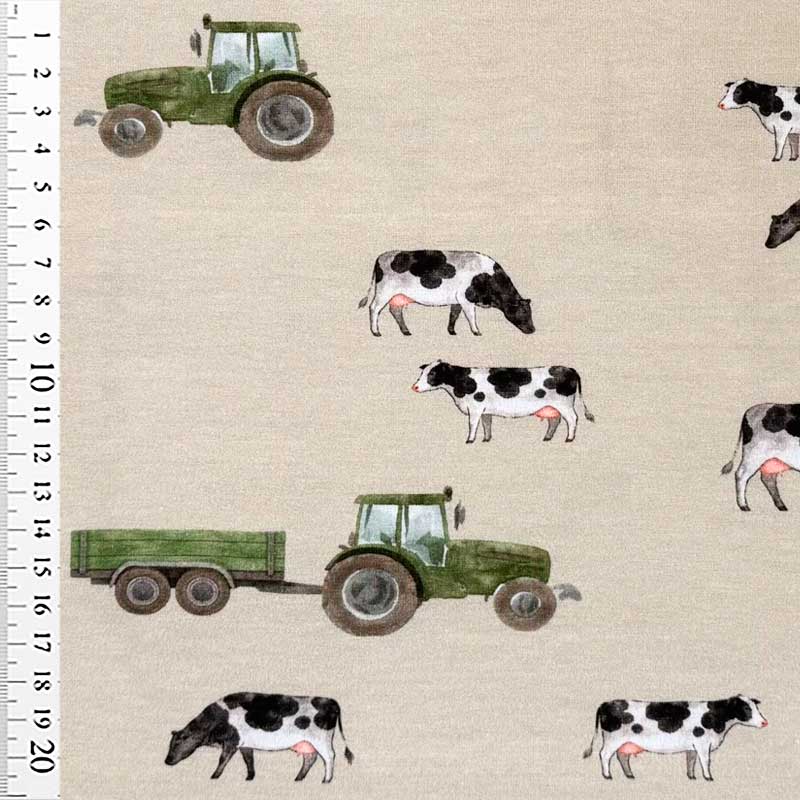 Digital bomuldsjersey med Ko og Traktor på sandfarvet bund (grønlig tone). En dejlig (200 g/m2) i OEKO-TEX kvalitet.