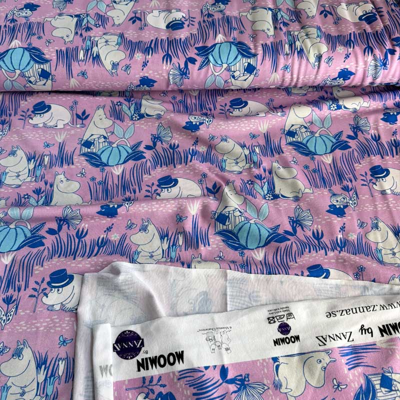 Digital bomuldsjersey med mumitroldene. En dejlig blød OEKO-TEX kvalitet. God til kjoler, tunika, bluser, nederdele og overdele og børneuniverset.