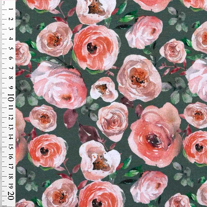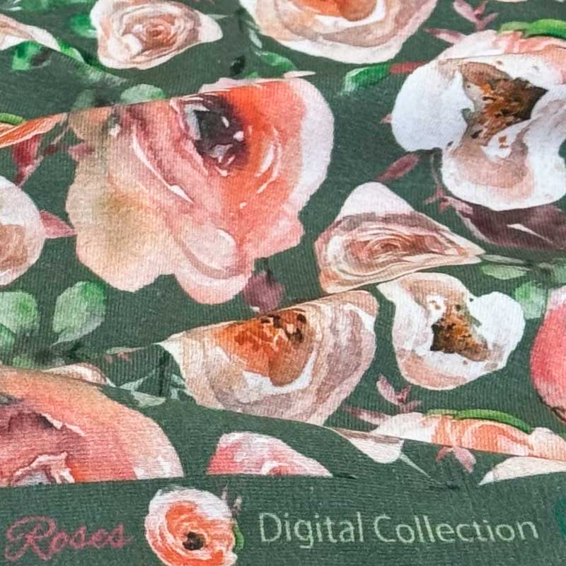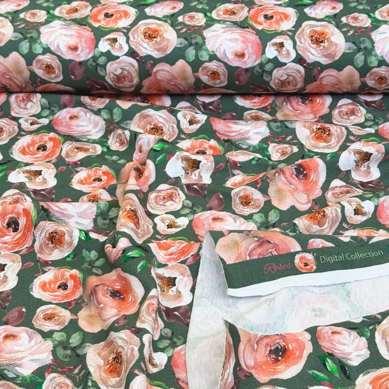 Digital bomuldsjersey med romantisk rosenhave på grøn bund. En dejlig (200 g/m2) i OEKO-TEX kvalitet.