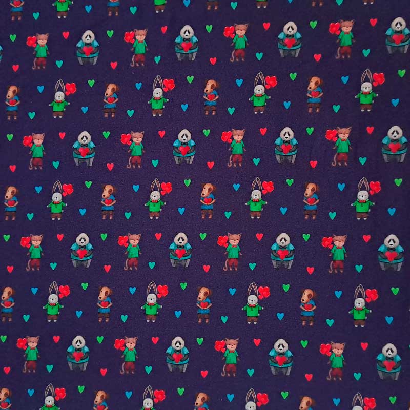 Digital bomuldsjersey med små dyr på række. En dejlig blød kvalitet. God til kjoler, tunika, bluser, nederdele og overdele og børneuniverset.