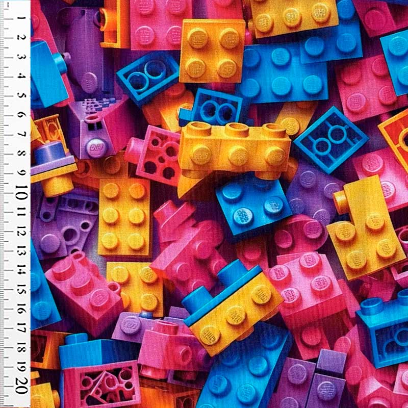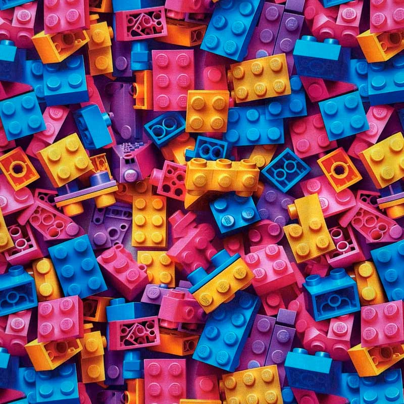 Digital bomuldsjersey med store Legoklodser. En dejlig blød kvalitet 220 g/m2. God til kjoler, tunika, bluser, nederdele, overdele og børneuniverset.