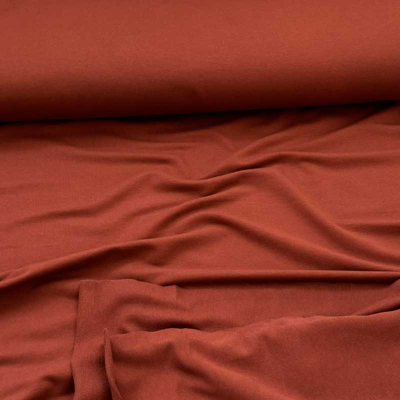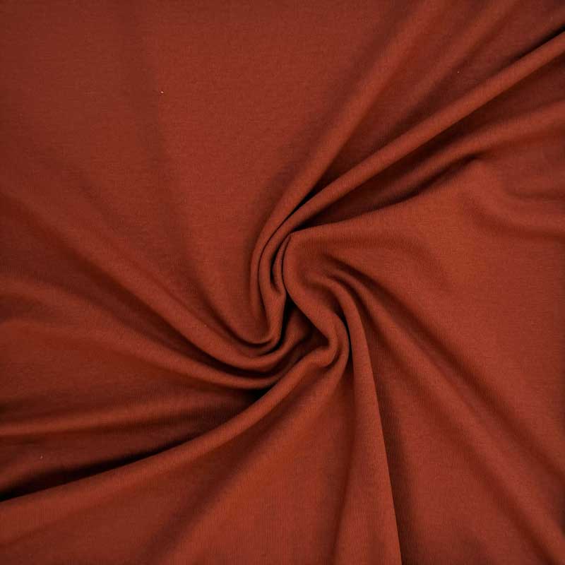 Ensfarvet bomuldsjersey i rustfarve. En dejlig OEKO-TEX kvalitet (210 g/m2). God til kjoler og bluser m.m.