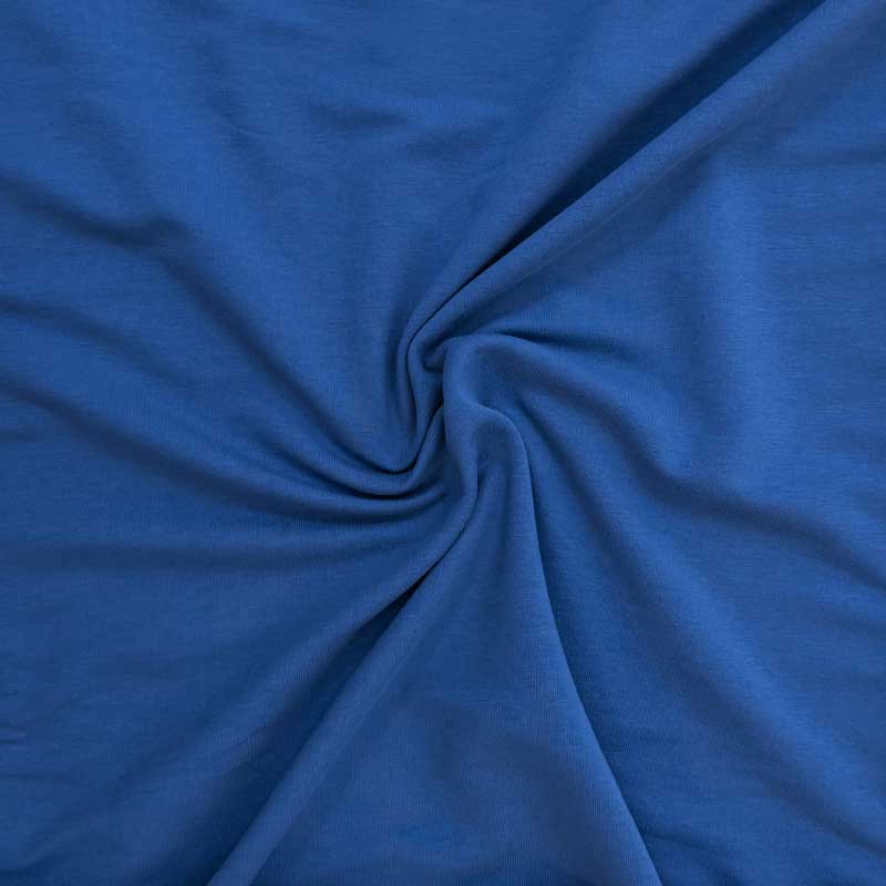 Ensfarvet French Terry i blå En dejlig OEKO-TEX kvalitet (230 g/m2). God til kjoler, bluser sweatshirts, hoodies. m.m.