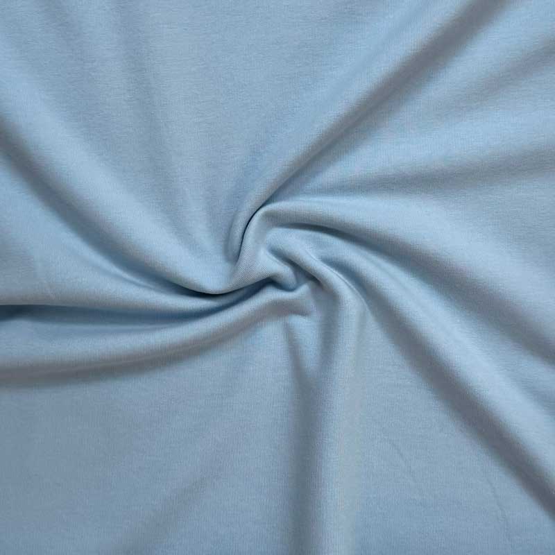 Ensfarvet Isoli i lyseblå. En dejlig blød metervare i OEKO-TEX kvalitet. God til kjoler, cardigan, trøjer, joggingtøj og børnetøj.