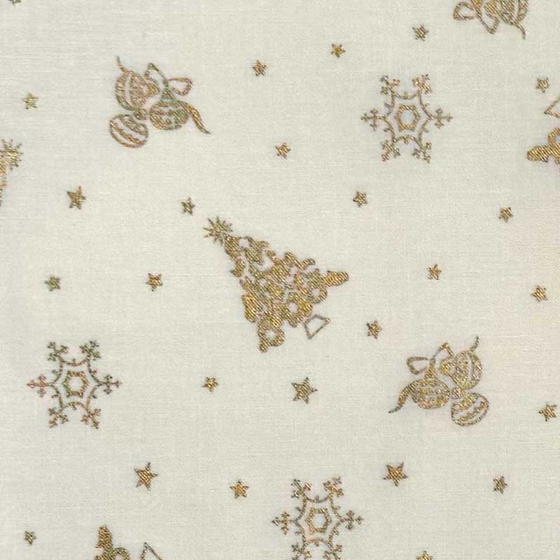 Fast bomuld med gyldent juletema på off white bund. En lækker fast kvalitet i 100% bomuld (120 gr/m2). God til tilbehør, pude, patchwork, dug m.m.