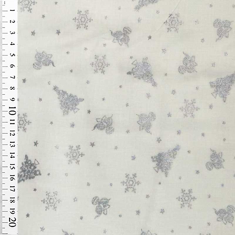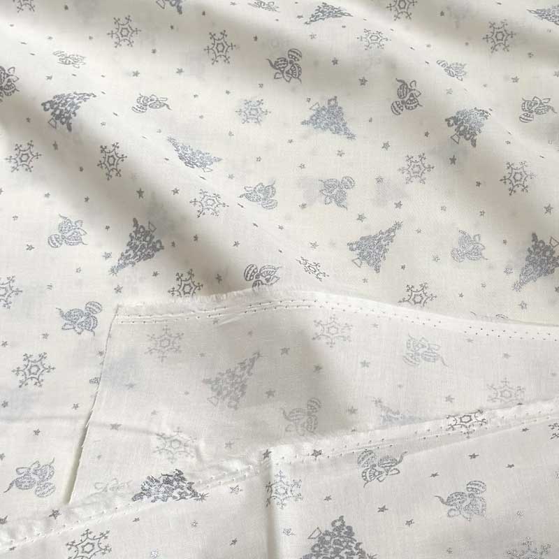 Fast bomuld med juletema i sølvglimmer på off-white bund. En lækker fast kvalitet i 100% bomuld (120 gr/m2). God til tilbehør, pude, patchwork, dug m.m.