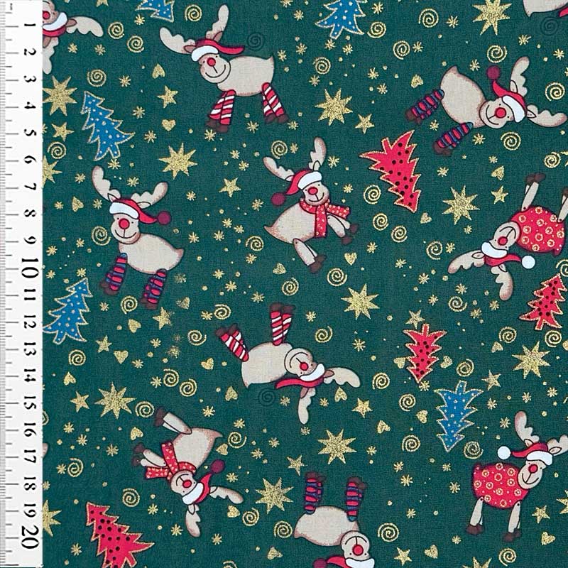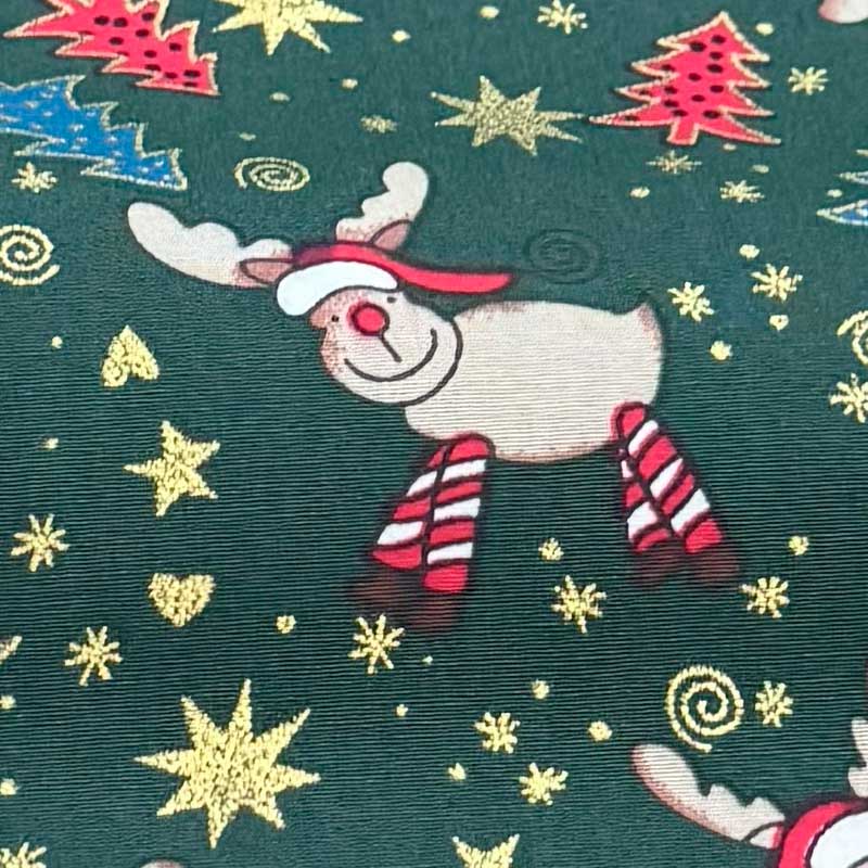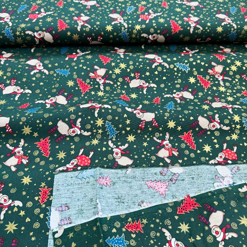 Fast bomuld med rensdyret Rudolf og juletræer på grøn bund. En lækker fast kvalitet i 100% bomuld (110 gr/m2). God til tilbehør, pude, patchwork, dug m.m.