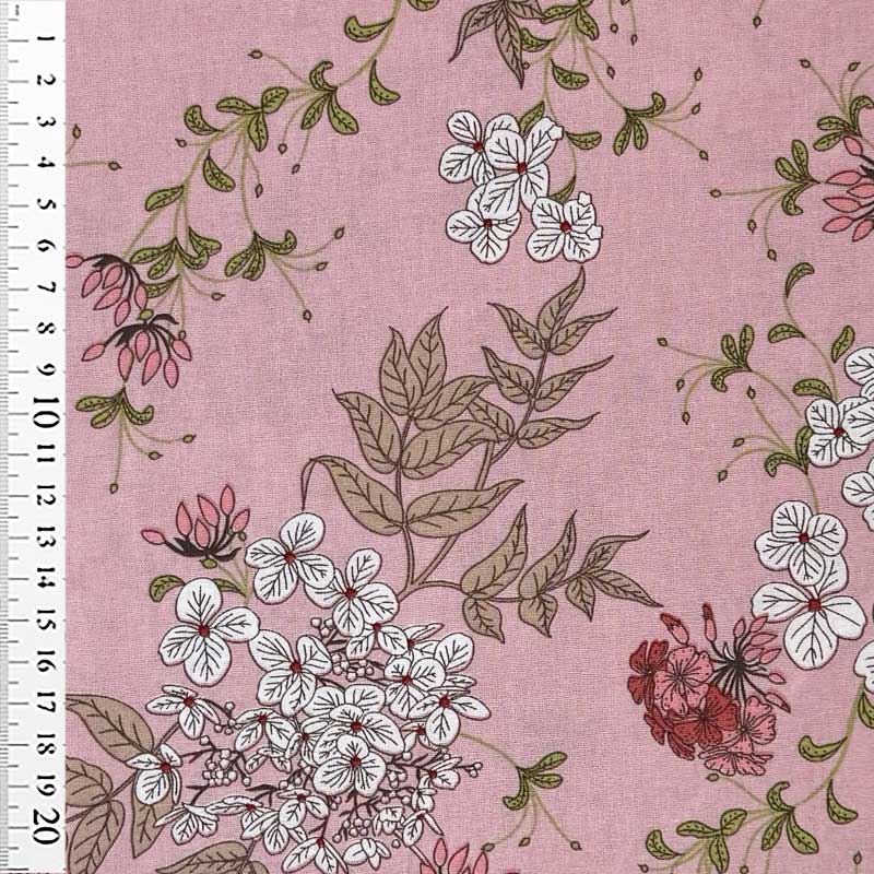 Fast bomuld med smuk blomster opsætning på lyserød bund. God kvalitet (154 gr/m2), som kan bruges til skjorter, bluser, kjoler, nederdele, lette bukser/shorts og børnetøj.