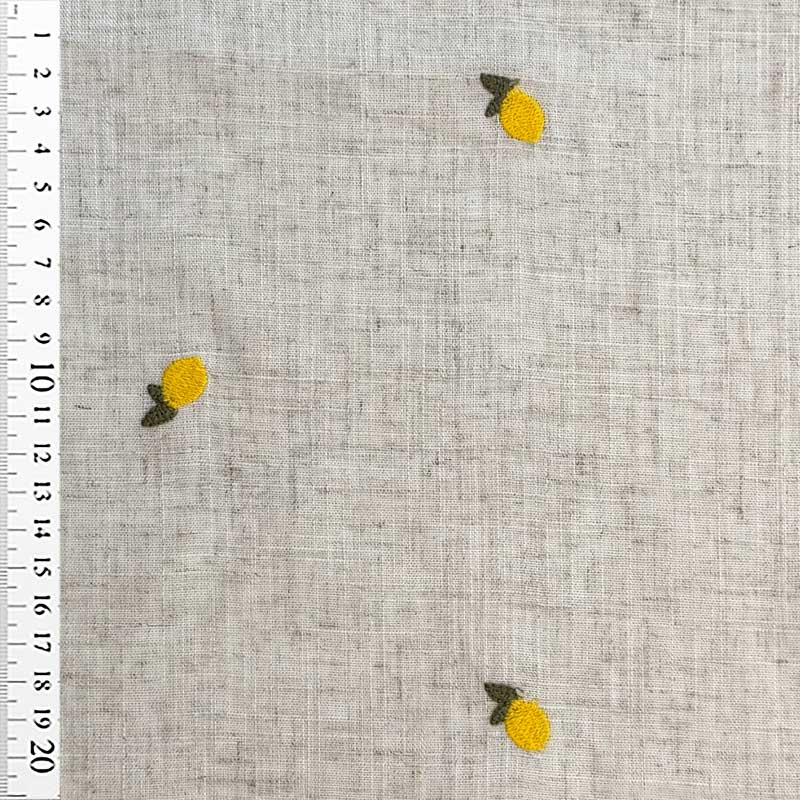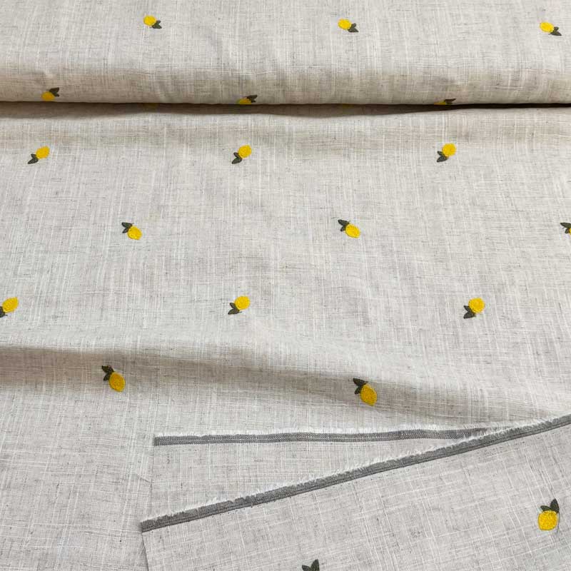Fast viscose / hør med broderede citroner på naturfarvet bund. En dejlig tynd fast kvalitet (180 g/m2). God til kjoler, skjorter, bluser, løs nederdele og bukser.