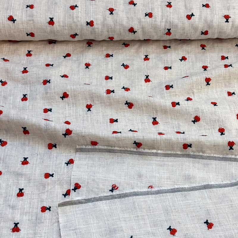 Fast viscose / hør med broderede kirsebær på naturfarvet bund. En dejlig tynd fast kvalitet (180 g/m2). God til kjoler, skjorter, bluser løs nederdele og bukser.