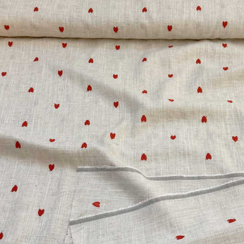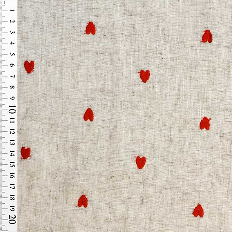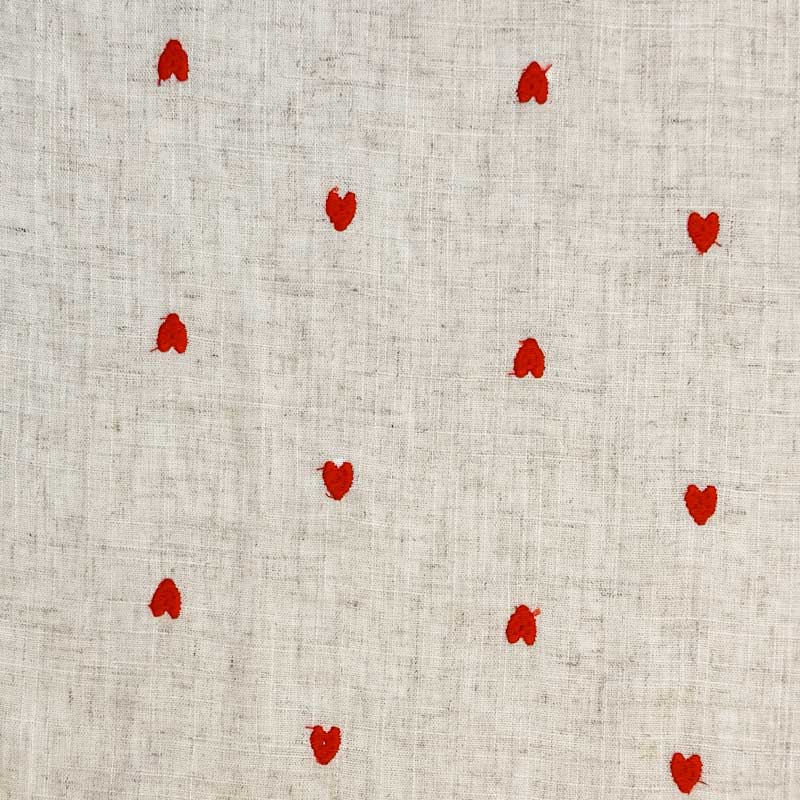 Fast viscose / hør med røde broderede hjerter på hørfarvet bund. En dejlig tynd fast kvalitet (180 g/m2). God til kjoler, skjorter, bluser løs nederdel og bukser.