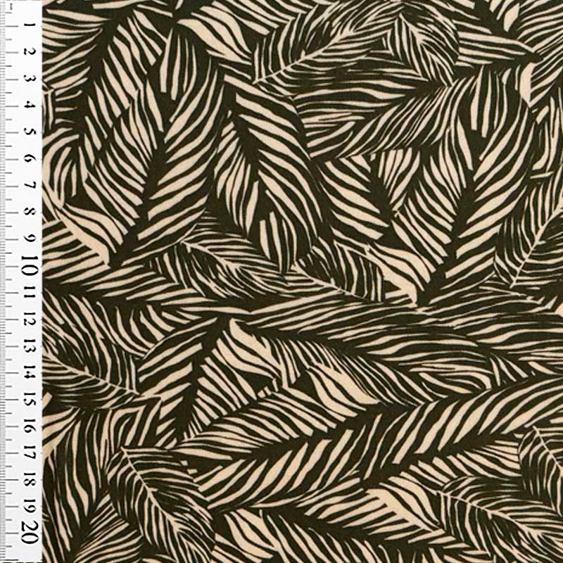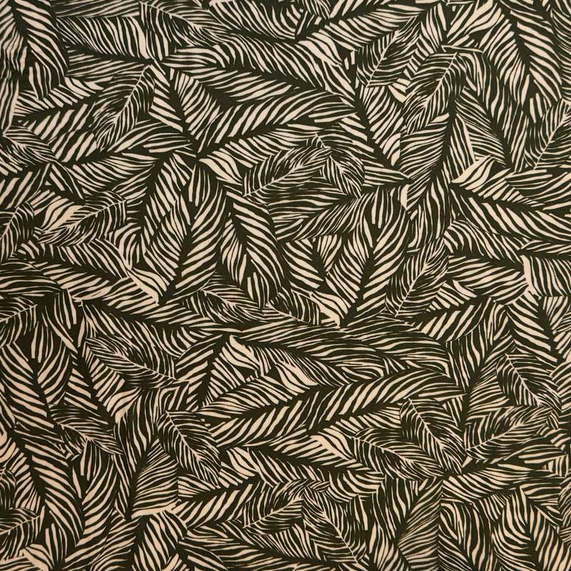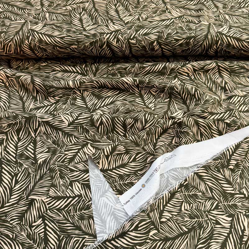 Fast viscose med blad print i natur og grøn. En fin og lækker vævet kvalitet (155 gr/m2), som falder flot. God til overdele, kjoler, skjortebluser.