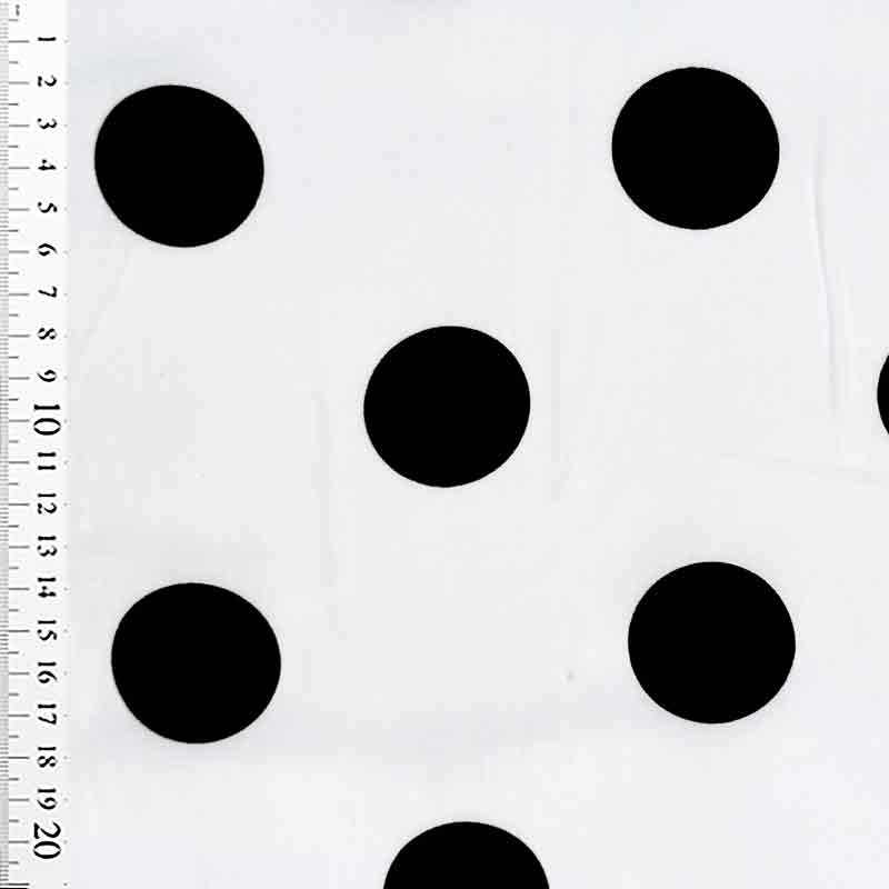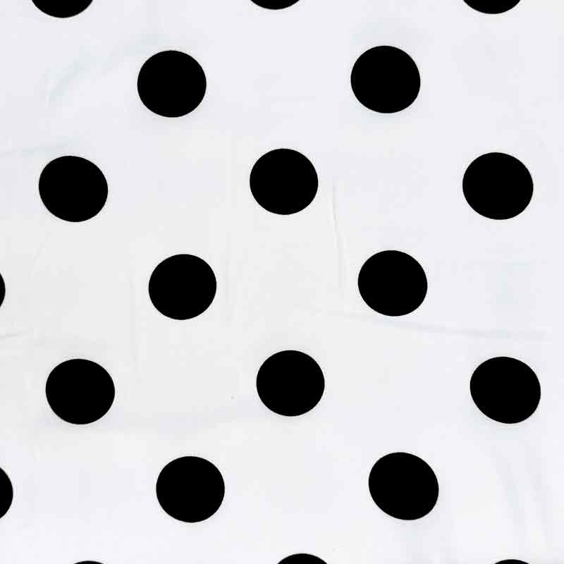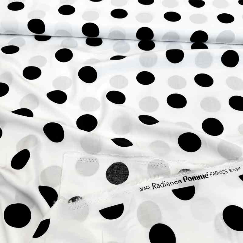 Fast viscose med store sorte prikker på hvid bund. En tynd, fin og lækker kvalitet (110 g/m2), som falder flot.