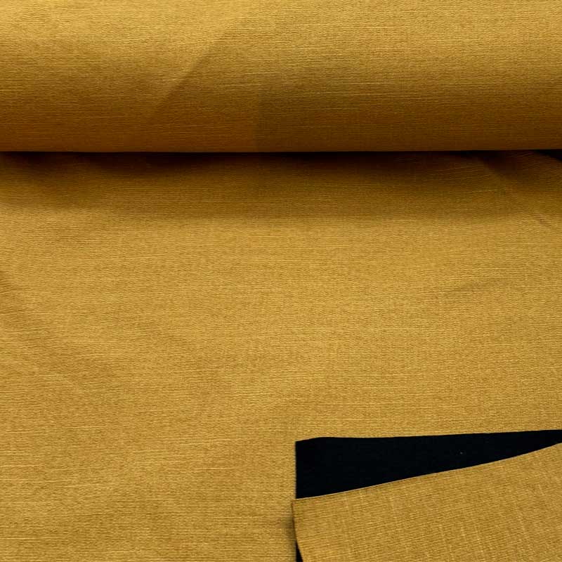Fastvævet møbelstof i karryfarvet hørlook. Møbelstof i flot hørlook design, med sort bagside, og i en superlækker og slidestærk kvalitet (50.000 Martindale). God til boligindretning, boligtilbehør, polstring af møbler m.m.