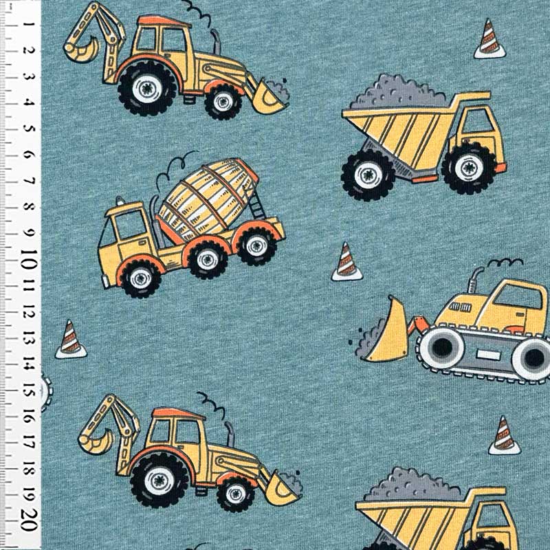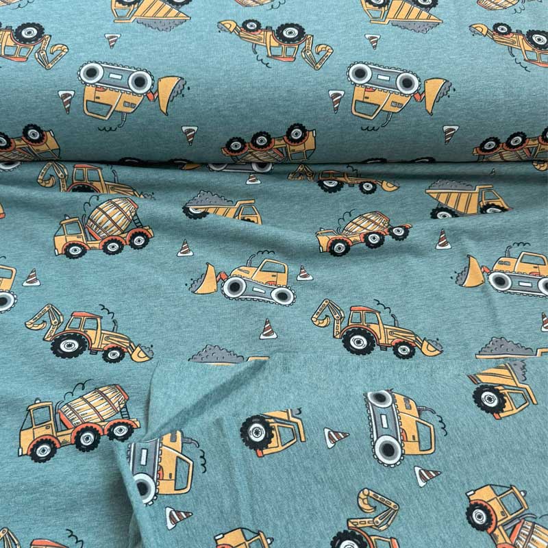 French Terry med lastbil og gravko på aqua meleret bund. En dejlig OEKO-TEX kvalitet (245 g/m2). God til kjoler, bluser sweatshirts, hoodies og (jogging) bukser. m.m.