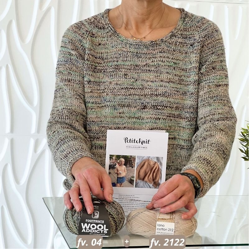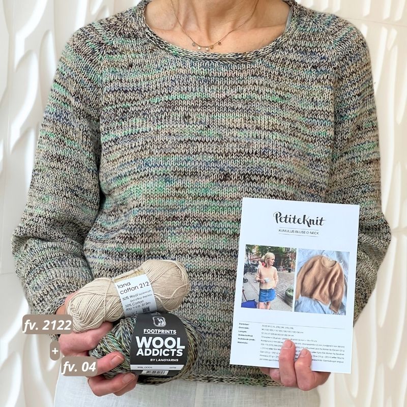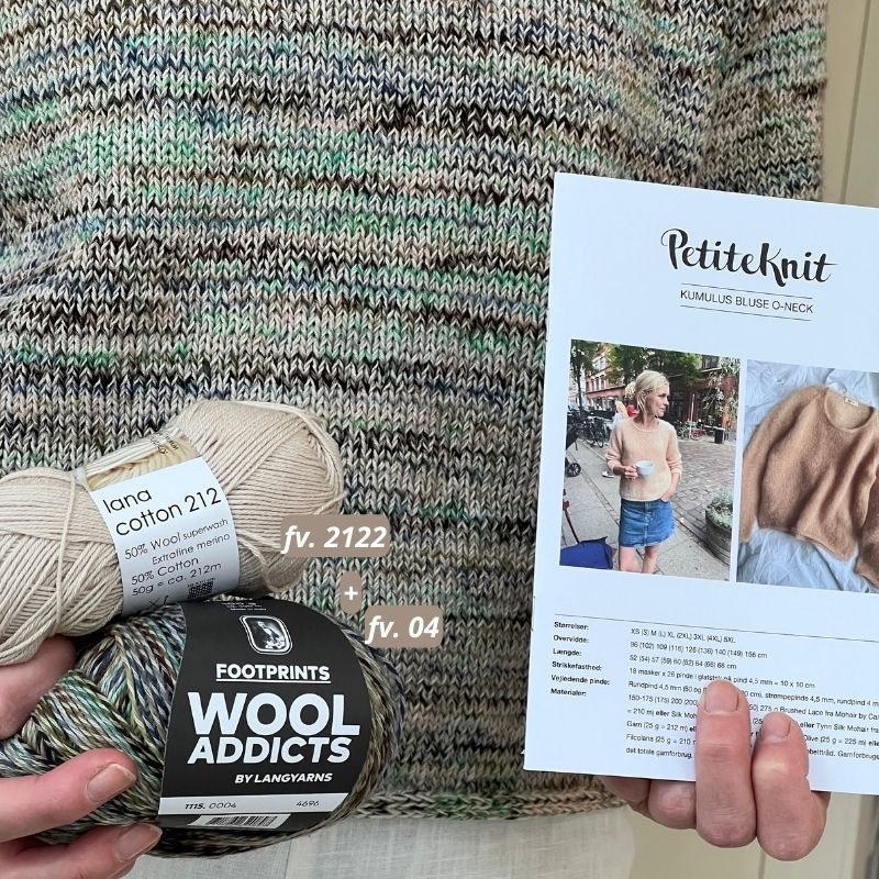 Garn til Kumulus Bluse O-neck fra PetiteKnit som strikkes oppefra og ned i Footprints garn fra Lang Yarns og Lana Cotton garn fra Hjertegarn.