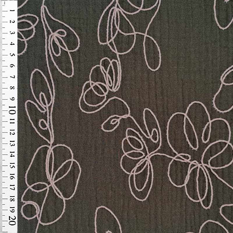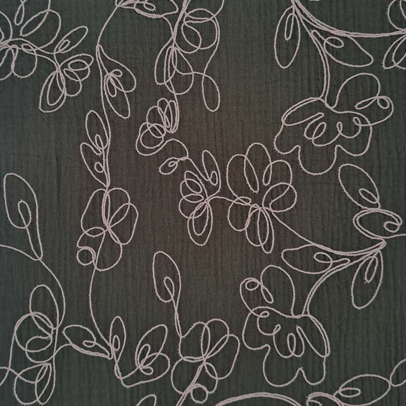 Gauze med broderet blomster i off white på en grøn bund. God til bluser, nederdele, kjoler, baby/børnetøj og meget andet.