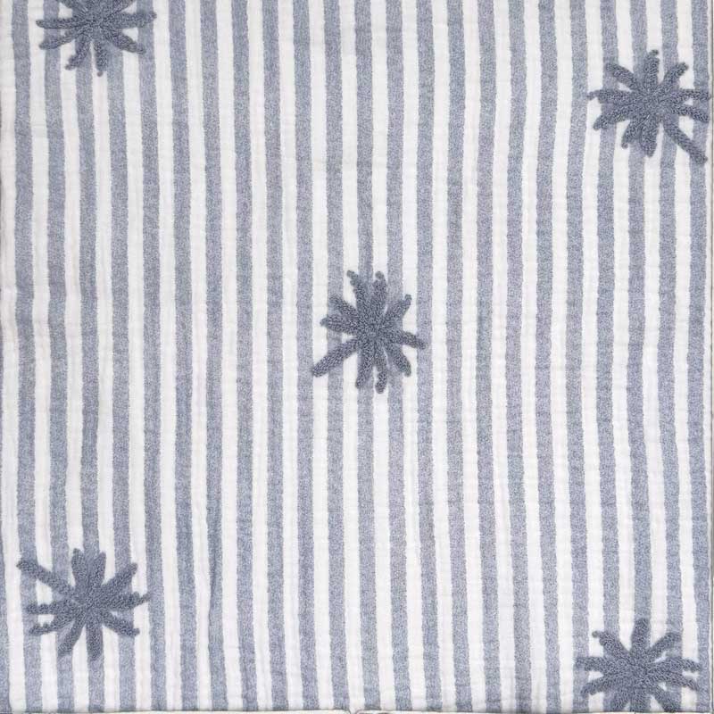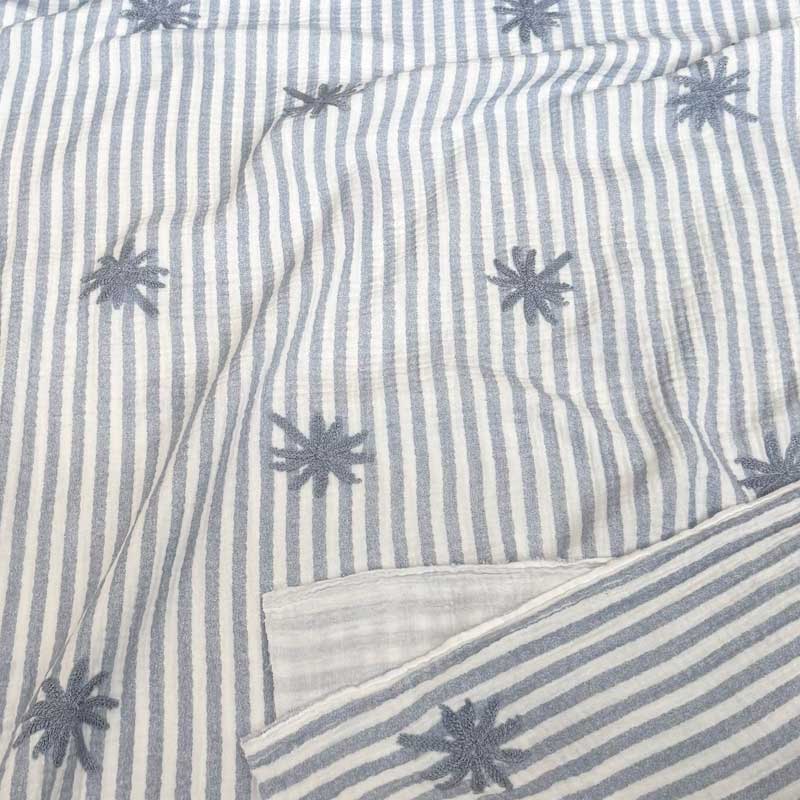 Gauze med jeansblå striber og broderet palme på hvid bund. en lækker 100% digital bomuld i Mousseline og OEKO-TEX kvalitet (160 g/m2). God til bluser, nederdele, kjoler, baby/børnetøj og meget andet.