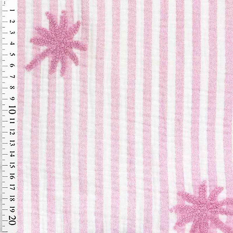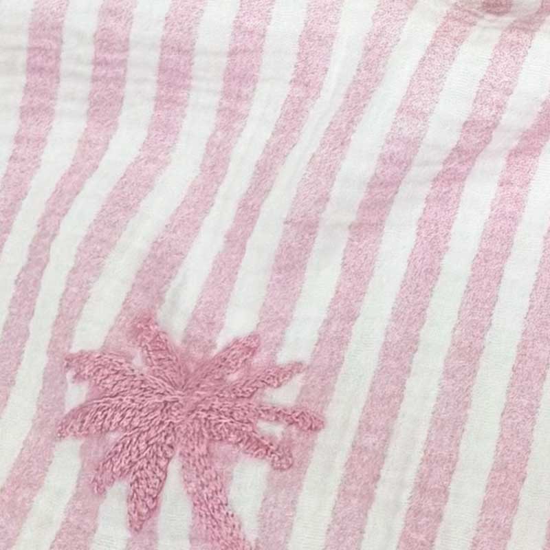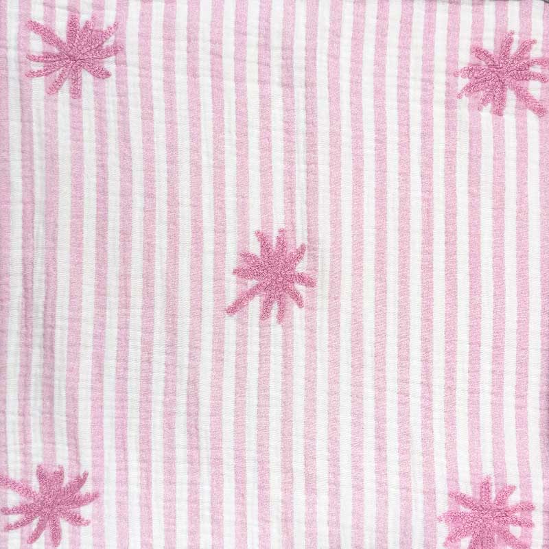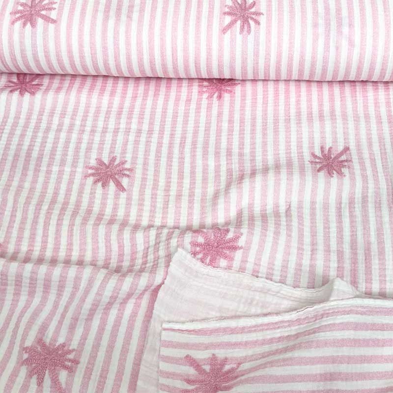Gauze med lyserød striber og broderet palme på hvid bund. en lækker 100% digital bomuld i Mousseline og OEKO-TEX kvalitet (160 g/m2). God til bluser, nederdele, kjoler, baby/børnetøj og meget andet.
