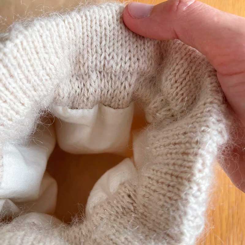 Den hvide Honey Bucket Bag er strikket i Sunday fra Sandnes Garn i farven Almond [2511] sammen med Tynd Silk Mohair fra Sandnes Garn i farven Kitt [1015].