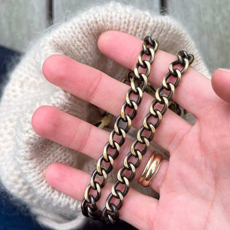 Honey Bucket Bag strikkes i ét stykke fra bunden og op. Først strikkes bunden i glatstrik, og herefter strikkes taskens sider i netpatent. Øverst strikkes en løbegang til snørelukning. Til slut sys et for, som monteres ind i tasken. Opskriften indeholder også syvejldning til for - God strik.