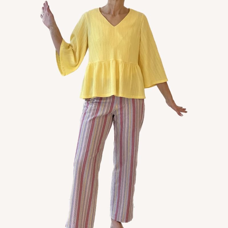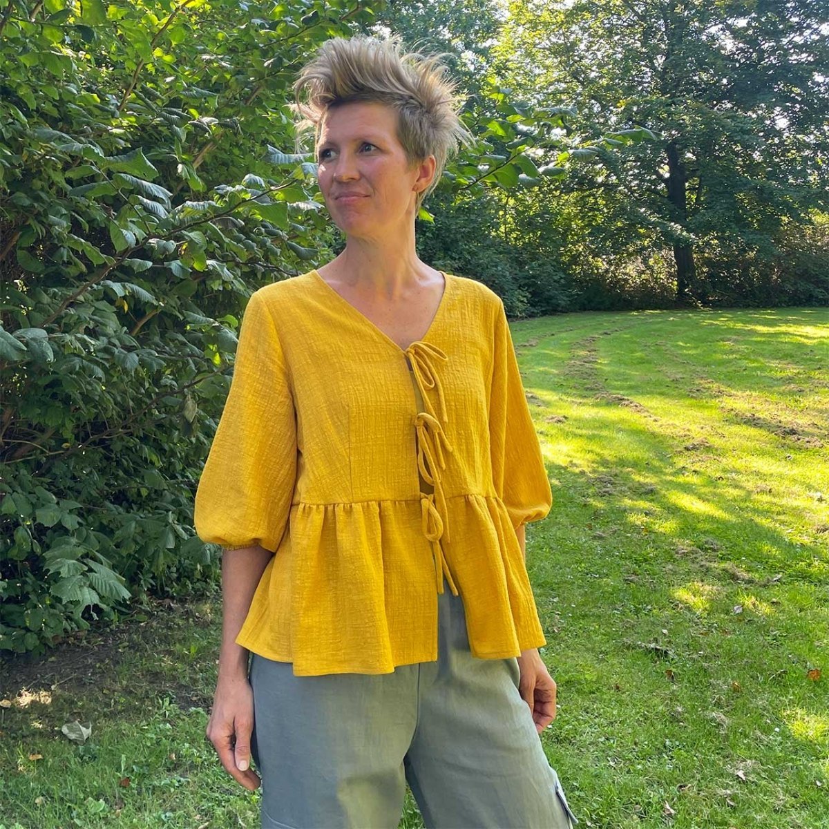 Line2Line snitmønster B1266, Peplum skjortebluse med bindebånd, til fast stof. Dette snitmønster kommer med en A og en B model. Model A er en skjorte med rund hals, belægning, stolpe og poseærme med elastik. Model B er med V-hals, skråbånd og klokkeærme. Model A og B kan kombineres alt efter ønske. Mønsteret indeholder alle størrelser fra 32-54. Niveau Medium.