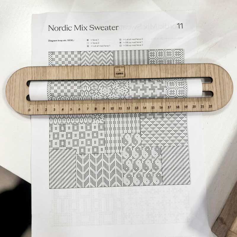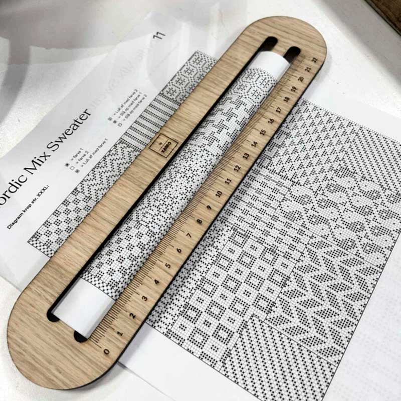 Lineal til læsning af strikkeopskrift 'Mellem linjerne' til A4 mønstre by KABRO. Elegant mønsterskabelon i lys egetræ