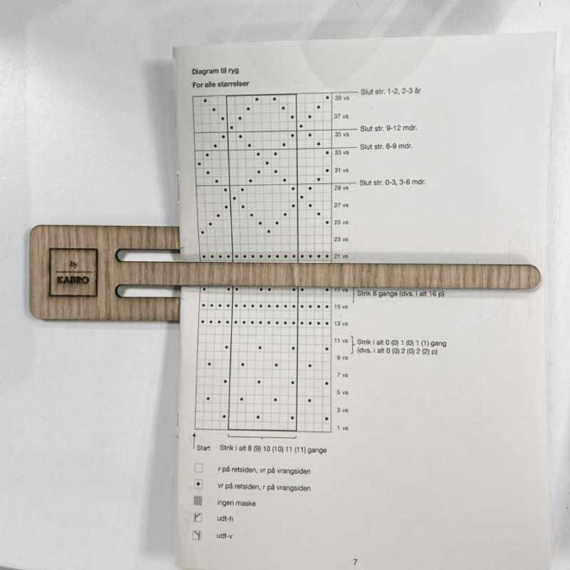 Lineal til læsning af strikkeopskrift 'Mellem linjerne' til A5 mønstre by KABRO. Elegant mønsterskabelon i lys egetræ.