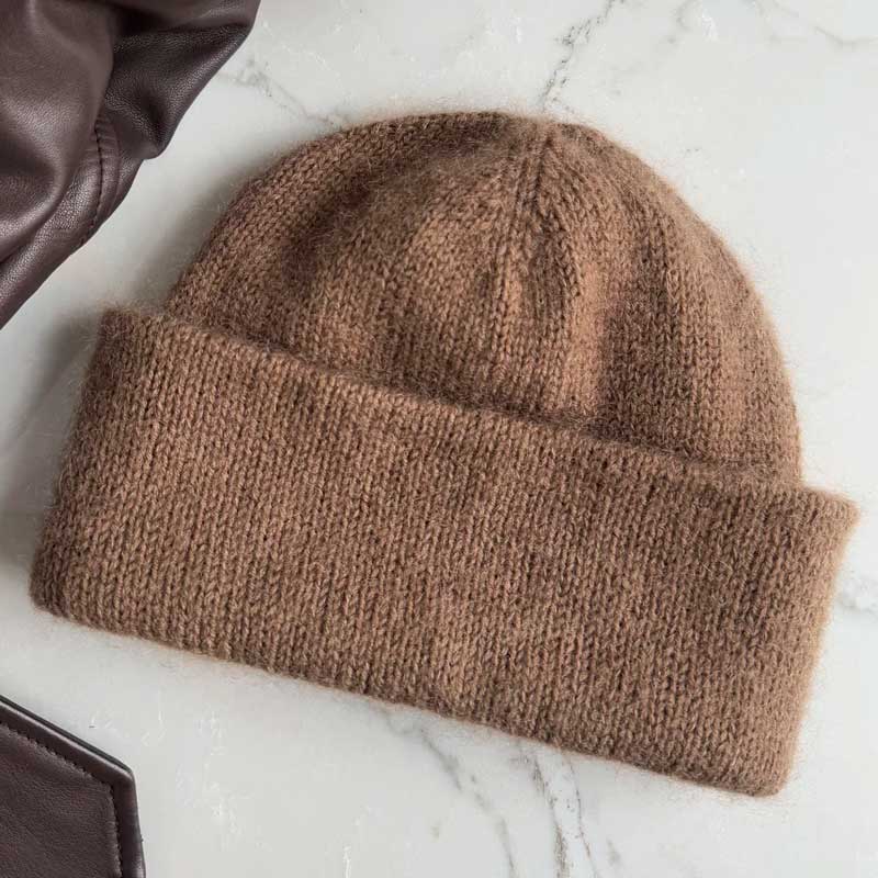 Den brune Oslo Hue er strikket i Sunday fra Sandnes Garn i farven Eikenøtt [3161] sammen med en anden garn.